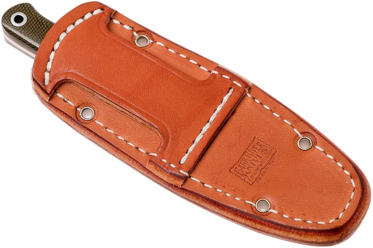 Bark River Bravo 1 A2, Black Green Camo Canvas Micarta, Funda Marrón